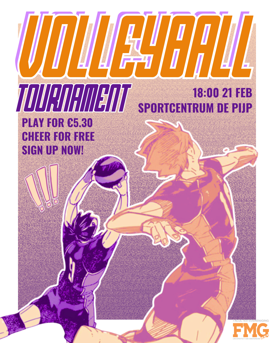 Participate in the first Fv-FMG event of the year! To kick off the year, we have a volleyball tournament, where the 9 associations form teams and battle it out to see which association is the best. Of course, not everyone wants to plat and a team needs its fans. So, make a sign, grab a drink and cheer from the stands!